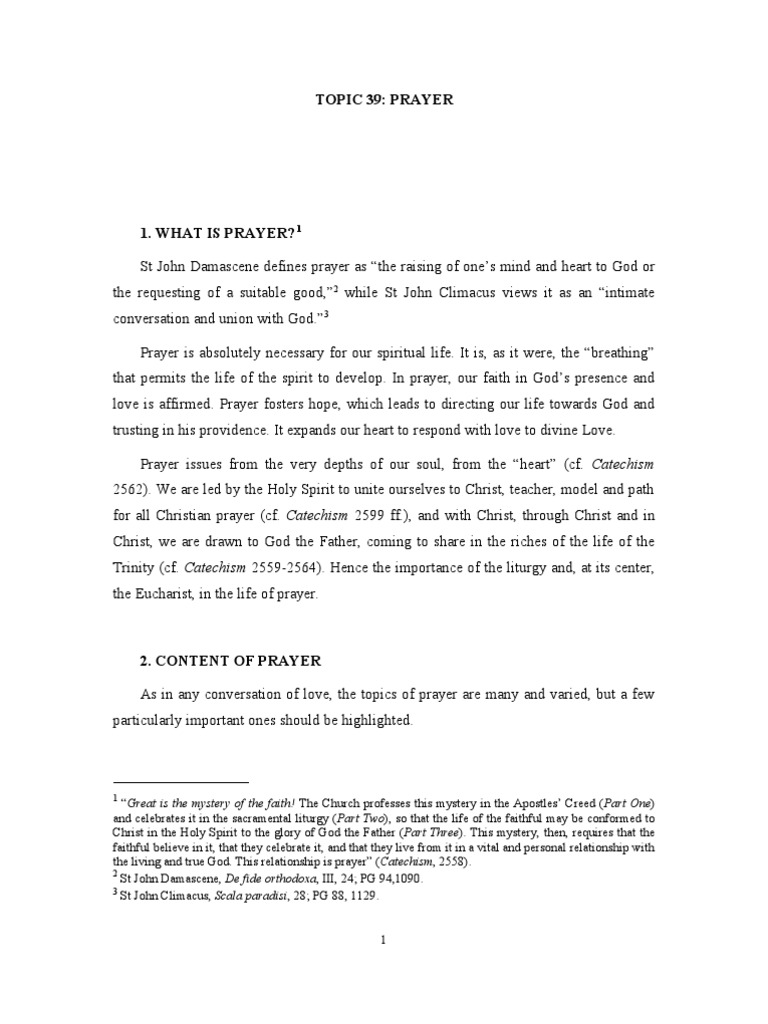 1. WHAT IS PRAYER? 1 St John Damascene defines prayer as the raising of ones mind and heart to God or the requesting of a suitable good,2 while St John Climacus views it as an intimate conversation and union with God.3 Prayer is absolutely necessary for our spiritual life. It is, as it were, the breathing that permits the life of the spirit to develop. In prayer, our faith in Gods presence and love is affirmed. Prayer fosters hope, which leads to directing our life towards God and trusting in his providence. It expands our heart to respond with love to divine Love. Prayer issues from the very depths of our soul, from the heart (cf. Catechism 2562). We are led by the Holy Spirit to unite ourselves to Christ, teacher, model and path for all Christian prayer (cf. Catechism 2599 ff.), and with Christ, through Christ and in Christ, we are drawn to God the Father, coming to share in the riches of the life of the Trinity (cf. Catechism 2559-2564). Hence the importance of the liturgy and, at its center, the Eucharist, in the life of prayer.