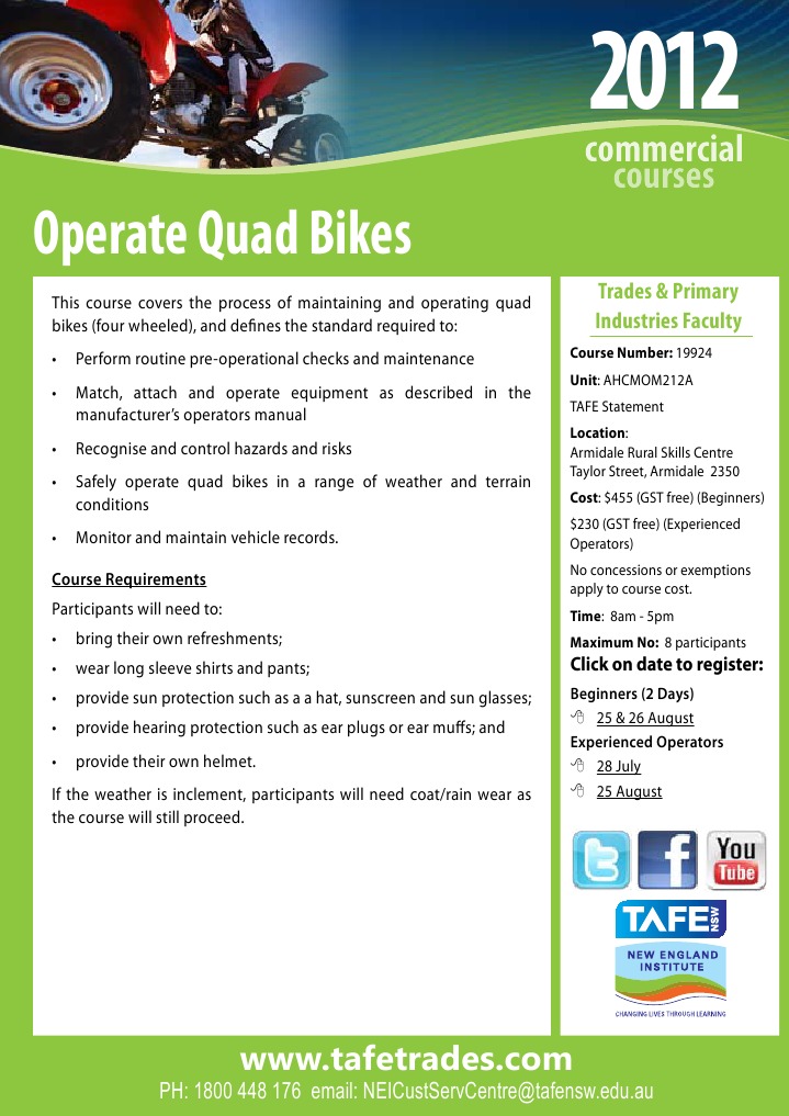 This course covers the process of maintaining and operating quad bikes (four wheeled), and defines the standard required to: Perform routine pre-operational checks and maintenance Match, attach and operate equipment as described in the manufacturers operators manual Recognise and control hazards and risks Safely operate quad bikes in a range of weather and terrain conditions Monitor and maintain vehicle records. Course Requirements Participants will need to: bring their own refreshments; wear long sleeve shirts and pants; provide sun protection such as a a hat, sunscreen and sun glasses; provide hearing protection such as ear plugs or ear muffs; and provide their own helmet. If the weather is inclement, participants will need coat/rain wear as the course will still proceed.