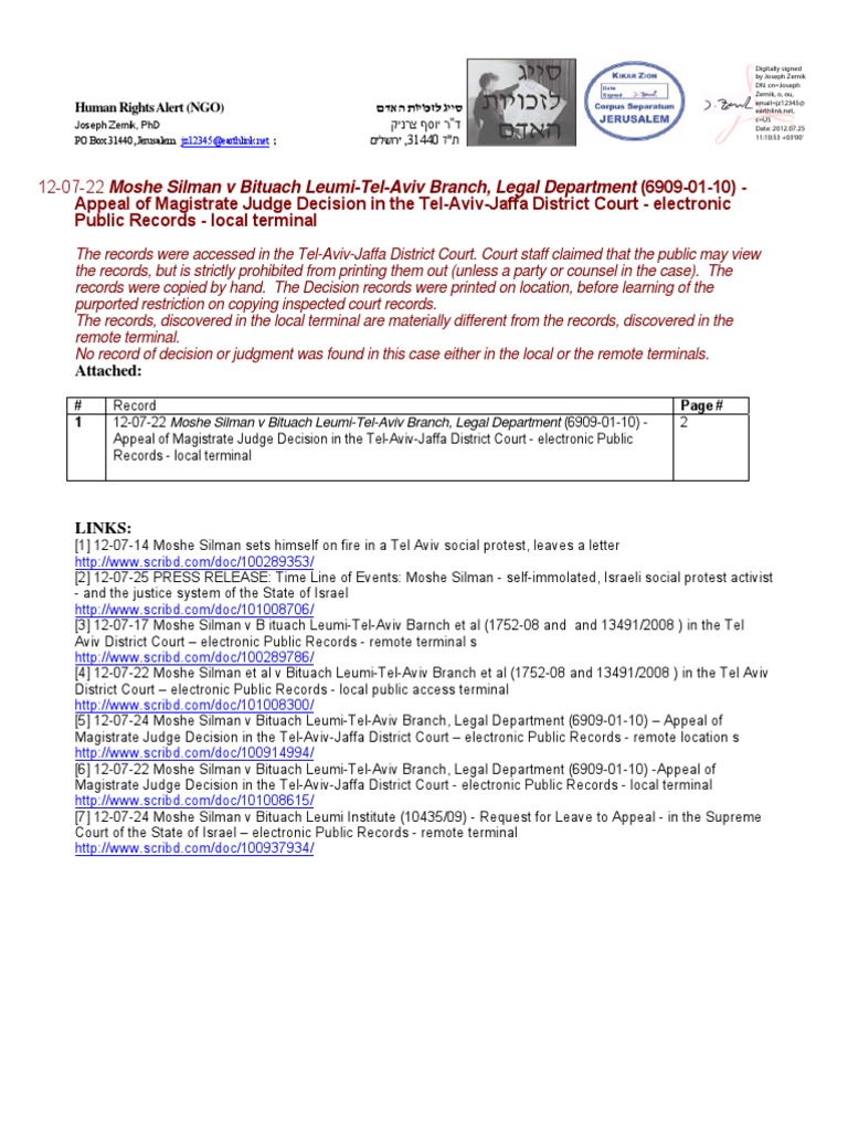The case of the late Moshe Silman shows how a Person is required to protect his rights in the courts of the State of Israel today against the State of Israel, which took his property and source of livelihood. Conditions, which have been established in the courts of the State of Israel, following the implementation of new electronic Public Records over the past decade, amount to serious violation of the Human Right "to a fair and public hearing."