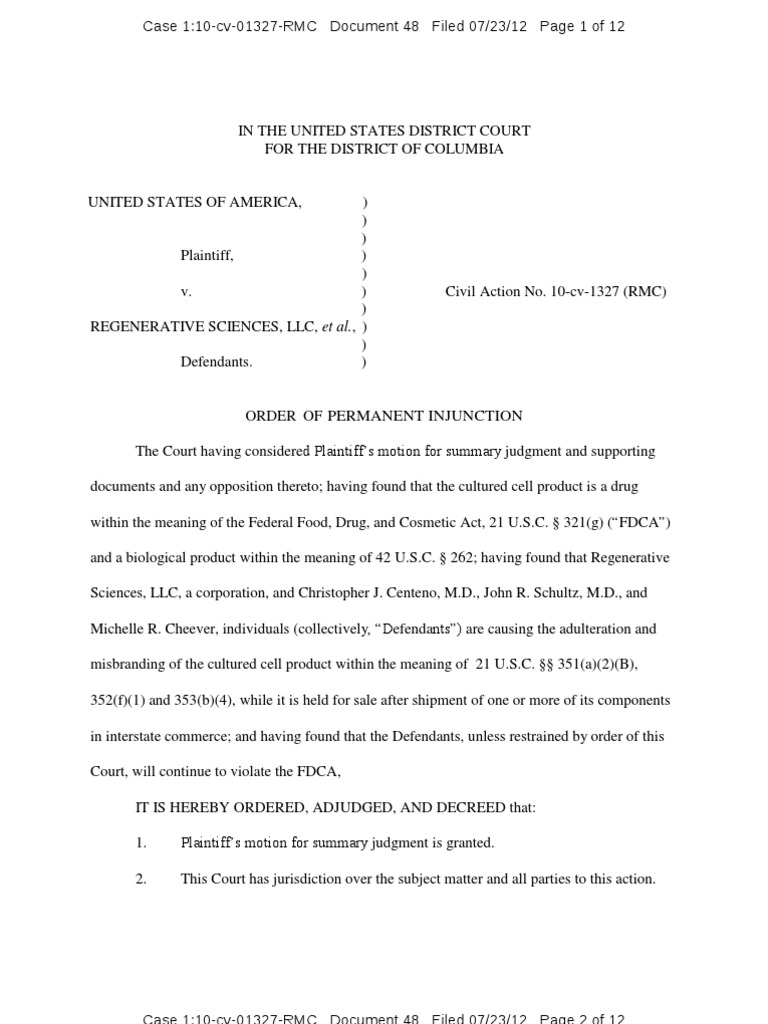 USA vs. Regenerative Sciences Order of Permanent Injunction