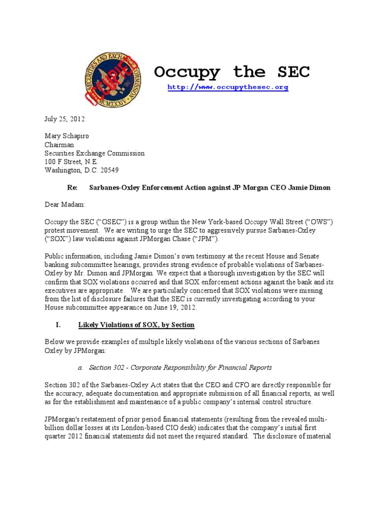 Occupy the SEC is urging the SEC to aggressively pursue SOX law violations against JPMorgan Chase. Public information, including Jamie Dimon's testimony, provides strong evidence of probable violations of SOX. We are particularly concerned that SOX violations were missing from the list of disclosure failures.
