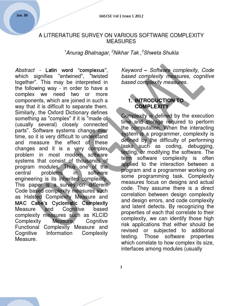 1. INTRODUCTION TO COMPLEXITY Complexity is defined by the execution time and storage required to perform the computation. When the interacting system is a programmer, complexity is defined by the difficulty of performing tasks such as coding, debugging, testing, or modifying the software. The term software complexity is often applied to the interaction between a program and a programmer working on some programming task. Complexity measures focus on designs and actual code. They assume there is a direct correlation between design complexity and design errors, and code complexity and latent defects. By recognizing the properties of each that correlate to their complexity, we can identify those high risk applications that either should be revised or subjected to additional testing. Those software properties which correlate to how complex its size, interfaces among modules (usually