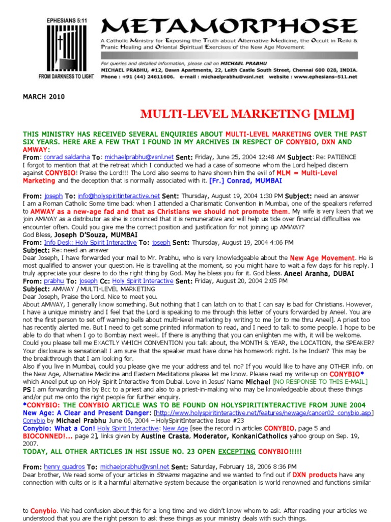 Christian ministries would probably prefer to examine that as well as whether the operational principles, business strategies and materialistic goals are Christian or, to be more specific, Biblical, especially since Amway in the U.S. of A. employs traditional evangelical Christian [revival-like meetings, etc.] approaches at its conventions and retreats along with suspect psychological techniques to create new "downlines". From various reports, we have noted that the ever-watchful Amway has the "Big Brother" habit of going after deserters and dissenters [violence, vilification, blackballing, defamatory statements, threats, harassment], and those who would criticize their operations in the print media or on the Internet, sending legal notices, having subpoenas issued, and suing anonymous bloggers and YouTubers, demanding they take down the offending material, while citing court judgements delivered in their favour. These judgements are on specific cases and against specific appeals, and are not binding on other individuals. In the Amway article, one will find that I have highlighted some of the positive aspects of Amway, reported their legal successes in a couple of cases [Amway pages 14/16, etc.], and reproduced their own FAQ sheet from the Amway web site. However, departing from tradition, I have not made any personal comment against, or passed any judgement on, Amway. What I have done is simply to collate information from various sources, and present it to the Catholic reader. There are hundreds -- if not thousands -- of such articles and news reports on Amway and on MLM in general, on the Internet, and I have reproduced a few so that the Catholic searching for clarification does not have to wade through an endless ocean of information, investing time, energy and money. This ministry has done that service, making it easy for someone with questions. The best of it all, I hope, is available here at this one-stop shop. I have also selected links that I found and I have included them in this article for the benefit of the reader who might want to study more extensively. With all that information, I am confident that the reader can decide for himself or herself whether the principles and modus operandi of direct selling and Multi- Level Marketing are anti-Christian or New Age in any way, and so on. I am unable to find anything instructive on the subject of Amway -- or on Multi- level Marketing -- written by Catholics, and would be most grateful to be provided with the same for inclusion here. Since Amway is the quintessential MLM [when people think MLM, they usually think Amway], any study of MLM will inevitably include comments on the leading obsession of all anti-MLMers. What I am trying to say is that this researcher has not singled out Amway with any malafide intention. This report on MLM also includes references to another MLM product, CONYBIO , on which I have written two separate articles, one in March 2004 and the other, CONYBIO- II, this month, March 2010. CONYBIO can be safely categorised as being both occult -- because of its underlying ancient Chinese esoteric philosophies -- and New Age because of the same as well as because of its mix of pseudo- scientific jargon with spirituality. Their links are: CONYBIO : [Link] CONYBIO- II_FALUN DAFA : [Link] I have also recently uploaded articles on some other MLM direct selling and e-scams BIOCONNED: WATER_MAGNETIC_FAR INFRARED_NEW AGE: [Link] BIO DISC: [Link] AMWAY : [Link] AMEGA GLOBAL_BIOLIFE _RUDRAANSHA : [Link] In the BIOCONNED and BIO DISC articles, a large number of products and devices are listed and analysed.
