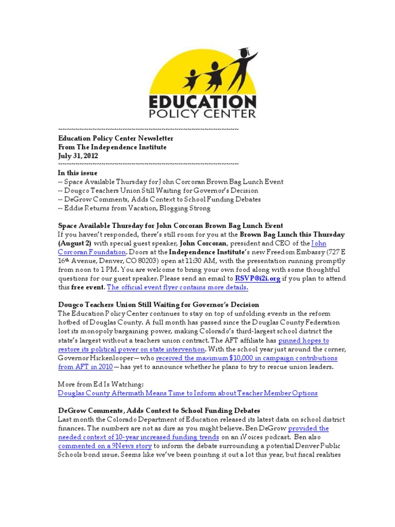 -- Space Available Thursday for John Corcoran Brown Bag Lunch Event -- Dougco Teachers Union Still Waiting for Governors Decision -- DeGrow Comments, Adds Context to School Funding Debates -- Eddie Returns from Vacation, Blogging Strong Space Available Thursday for John Corcoran Brown Bag Lunch Event If you havent responded, theres still room for you at the Brown Bag Lunch this Thursday (August 2) with special guest speaker, John Corcoran, president and CEO of the John Corcoran Foundation. Doors at the Independence Institutes new Freedom Embassy (727 E 16th Avenue, Denver, CO 80203) open at 11:30 AM, with the presentation running promptly from noon to 1 PM. You are welcome to bring your own food along with some thoughtful questions for our guest speaker. Please send an email to RSVP@i2i.org if you plan to attend this free event. The official event flyer contains more details. Dougco Teachers Union Still Waiting for Governors Decision The Education Policy Center continues to stay on top of unfolding events in the reform hotbed of Douglas County. A full month has passed since the Douglas County Federation lost its monopoly bargaining power, making Colorados third-largest school district the states largest without a teachers union contract. The AFT affiliate has pinned hopes to restore its political power on state intervention. With the school year just around the corner, Governor Hickenlooperwho received the maximum $10,000 in campaign contributions from AFT in 2010has yet to announce whether he plans to try to rescue union leaders. More from Ed Is Watching: Douglas County Aftermath Means Time to Inform about Teacher Member Options DeGrow Comments, Adds Context to School Funding Debates Last month the Colorado Department of Education released its latest data on school district finances. The numbers are not as dire as you might believe. Ben DeGrow provided the needed context of 10-year increased funding trends on an iVoices podcast. Ben also commented on a 9News story to inform the debate surrounding a potential Denver Public Schools bond issue. Seems like weve been pointing it out a lot this year, but fiscal realities