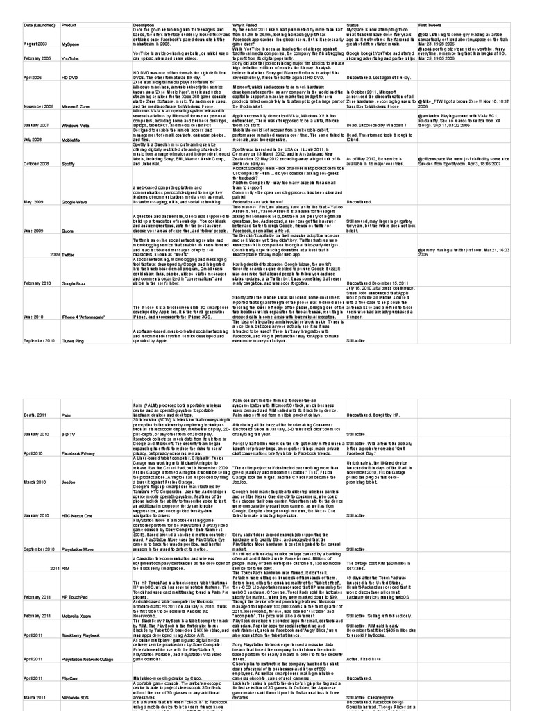 Sony Playstation Network experienced a massive data breach that forced the company to shut down the cloudbased platform for nearly a month in order to fix the security issues. Active. Fixed issue. Cisco's plan to restructure the company involved the shut down of several of its businesses and let go of 550 employees. As well as smartphones making mini video cameras obsolete, sales of such cameras. Discontinued. Lackluster sales in part to the device's high price tag and a limited selection of 3D games. In October, the Japanese game-maker said it would post its first annual loss in three decades. Still active. Cheaper price. Discontinued. Facebook bough Gowalla instead. Though Places as a service flopped, Facebook began Was a huge privacy concern & unavailable at some offering more location-tagging options locations. The check-in service survived only by the roughly for wall posts, photos and status 30 million people who actually used it. updates.