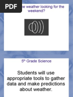 see in the local weather broadcast (using ActivBoard). Tell them to look for the instruments they use, the order they present the information, and what is the final idea they want to present to us. Right now, we are not interested in the numbers they show, just the type of information they are giving us. 2. Show a clip of a weather broadcast from a local news station. 3. Have the class members write down what the meteorologist showed as part of his/her weather presentation. 4. They may write: o The current days past statistics (kind of precipitation, amount of precipitation, air temperaturehighs and lows, and wind speed). o The present conditions (kind of precipitation, air temperature, wind direction, wind speed, cloud cover, and air pressure rising, dropping, or stable). o What tomorrows weather is going to be (kind of precipitation, amount of precipitation, air temperaturehighs and lows, wind speed, wind direction, and cloud cover). 5. Discuss what they observed about the weather broadcast. 6. Ask the students, How did the meteorologist know what the past weather conditions were? (They used the weather instruments we talked about.) 7. Ask the students, How did the meteorologist know what the present weather conditions were? (They used the weather instruments we talked about.) 8. Ask the students, What are the instruments he used to tell us about the weather of the day? (The rain gauge or ruler, thermometer, anemometer, and others they may name.) 9. Ask the students, Why are these weather instruments important? (They tell us what the past weather was and what the present weather is.) 10. Ask the students, Why is it important to us to know what the present weather is? (We know what we need to wear to be comfortable out in the weather.) 11. Ask the students, Why do you think it is important that we keep track of the weather and record it day by day? (Some will give guesses to this question, but the students may not directly know this answer. You may want to help them along with more questioning to get to the right answer.)