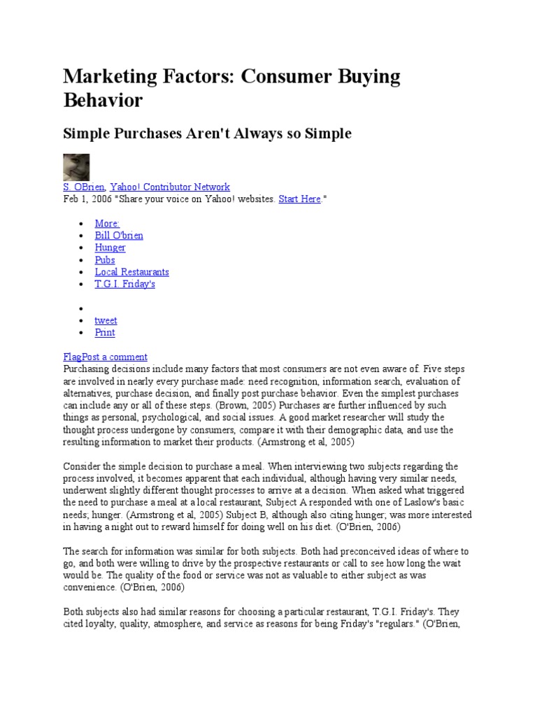 FlagPost a comment Purchasing decisions include many factors that most consumers are not even aware of. Five steps are involved in nearly every purchase made: need recognition, information search, evaluation of alternatives, purchase decision, and finally post purchase behavior. Even the simplest purchases can include any or all of these steps. (Brown, 2005) Purchases are further influenced by such things as personal, psychological, and social issues. A good market researcher will study the thought process undergone by consumers, compare it with their demographic data, and use the resulting information to market their products. (Armstrong et al, 2005) Consider the simple decision to purchase a meal. When interviewing two subjects regarding the process involved, it becomes apparent that each individual, although having very similar needs, underwent slightly different thought processes to arrive at a decision. When asked what triggered the need to purchase a meal at a local restaurant, Subject A responded with one of Laslow's basic needs; hunger. (Armstrong et al, 2005) Subject B, although also citing hunger; was more interested in having a night out to reward himself for doing well on his diet. (O'Brien, 2006) The search for information was similar for both subjects. Both had preconceived ideas of where to go, and both were willing to drive by the prospective restaurants or call to see how long the wait would be. The quality of the food or service was not as valuable to either subject as was convenience. (O'Brien, 2006) Both subjects also had similar reasons for choosing a particular restaurant, T.G.I. Friday's. They cited loyalty, quality, atmosphere, and service as reasons for being Friday's "regulars." (O'Brien,