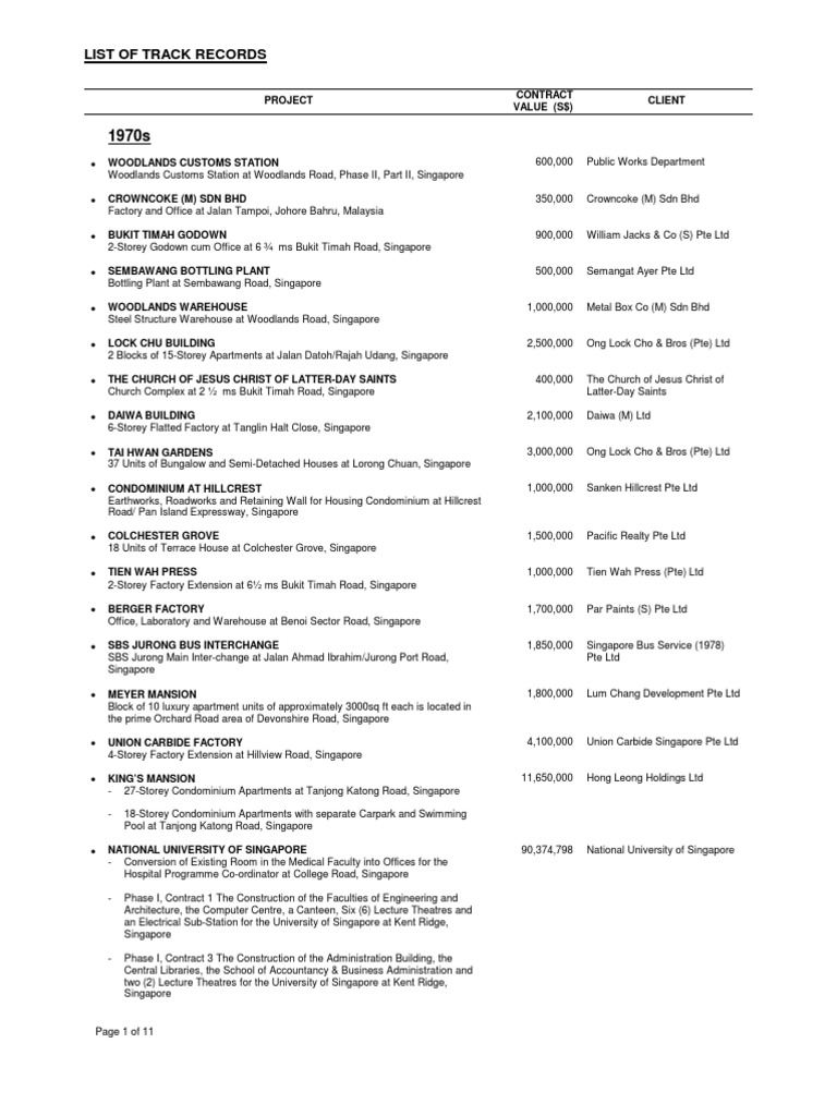 WOODLANDS CUSTOMS STATION Woodlands Customs Station at Woodlands Road, Phase II, Part II, Singapore CROWNCOKE (M) SDN BHD Factory and Office at Jalan Tampoi, Johore Bahru, Malaysia BUKIT TIMAH GODOWN 2-Storey Godown cum Office at 6 ms Bukit Timah Road, Singapore SEMBAWANG BOTTLING PLANT Bottling Plant at Sembawang Road, Singapore WOODLANDS WAREHOUSE Steel Structure Warehouse at Woodlands Road, Singapore LOCK CHU BUILDING 2 Blocks of 15-Storey Apartments at Jalan Datoh/Rajah Udang, Singapore THE CHURCH OF JESUS CHRIST OF LATTER-DAY SAINTS Church Complex at 2 ms Bukit Timah Road, Singapore DAIWA BUILDING 6-Storey Flatted Factory at Tanglin Halt Close, Singapore TAI HWAN GARDENS 37 Units of Bungalow and Semi-Detached Houses at Lorong Chuan, Singapore CONDOMINIUM AT HILLCREST Earthworks, Roadworks and Retaining Wall for Housing Condominium at Hillcrest Road/ Pan Island Expressway, Singapore COLCHESTER GROVE 18 Units of Terrace House at Colchester Grove, Singapore TIEN WAH PRESS 2-Storey Factory Extension at 6 ms Bukit Timah Road, Singapore BERGER FACTORY Office, Laboratory and Warehouse at Benoi Sector Road, Singapore SBS JURONG BUS INTERCHANGE SBS Jurong Main Inter-change at Jalan Ahmad Ibrahim/Jurong Port Road, Singapore MEYER MANSION Block of 10 luxury apartment units of approximately 3000sq ft each is located in the prime Orchard Road area of Devonshire Road, Singapore UNION CARBIDE FACTORY 4-Storey Factory Extension at Hillview Road, Singapore KINGS MANSION - 27-Storey Condominium Apartments at Tanjong Katong Road, Singapore 18-Storey Condominium Apartments with separate Carpark and Swimming Pool at Tanjong Katong Road, Singapore 90,374,798 National University of Singapore 600,000 Public Works Department