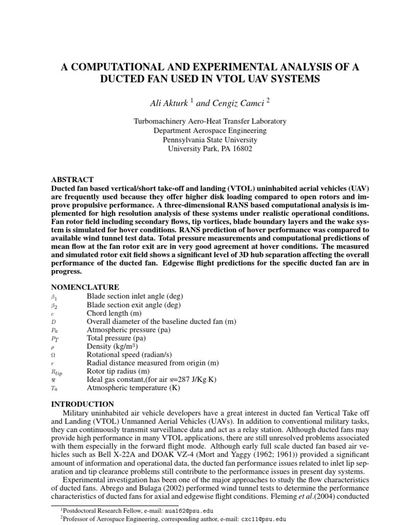 wind tunnel experiments and computational studies around a 305 mm diameter ducted fan. They have