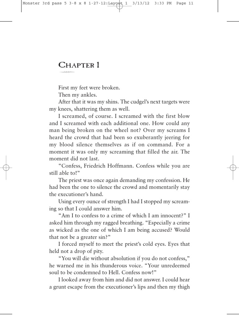 First my feet were broken. Then my ankles. After that it was my shins. The cudgels next targets were my knees, shattering them as well. I screamed, of course. I screamed with the first blow and I screamed with each additional one. How could any man being broken on the wheel not? Over my screams I heard the crowd that had been so exuberantly jeering for my blood silence themselves as if on command. For a moment it was only my screaming that filled the air. The moment did not last. Confess, Friedrich Hoffmann. Confess while you are still able to! The priest was once again demanding my confession. He had been the one to silence the crowd and momentarily stay the executioners hand. Using every ounce of strength I had I stopped my screaming so that I could answer him. Am I to confess to a crime of which I am innocent? I asked him through my ragged breathing. Especially a crime as wicked as the one of which I am being accused? Would that not be a greater sin? I forced myself to meet the priests cold eyes. Eyes that held not a drop of pity. You will die without absolution if you do not confess, he warned me in his thunderous voice. Your unredeemed soul to be condemned to Hell. Confess now! I looked away from him and did not answer. I could hear a grunt escape from the executioners lips and then my thigh