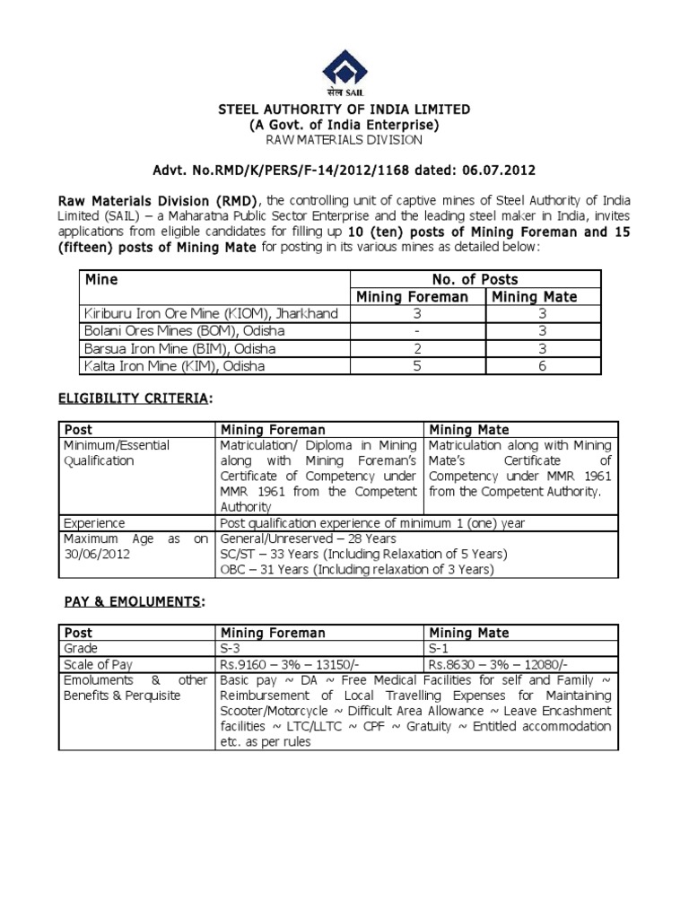 2012 Raw Materials Division (RMD) , the controlling unit of captive mines of Steel Authority of India Limited (SAIL) a Maharatna Public Sector Enterprise and the leading steel maker in India, invites applications from eligible candidates for filling up 10 (ten) posts of Mining Foreman and 15 (fifteen) posts of Mining Mate for posting in its various mines as detailed below: