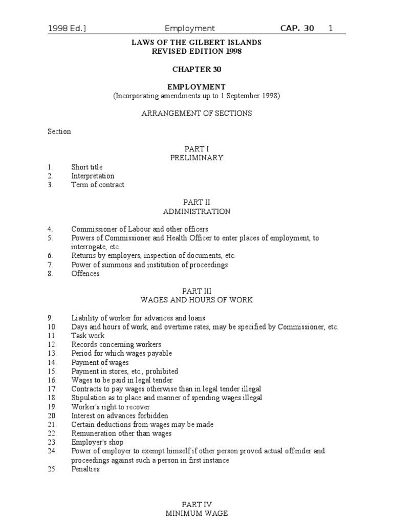 Employment LAWS OF THE GILBERT ISLANDS REVISED EDITION 1998 CHAPTER 30 EMPLOYMENT (Incorporating amendments up to 1 September 1998) ARRANGEMENT OF SECTIONS