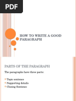 sentences. Good writers go through several steps to produce a good piece of writing. PRE WRITING STEP ONE: Choose a topic. Your teacher may give you a topic or ideas to write about. If not, choose your topic yourself. STEP TWO: Gather ideas. When you have selected your topic, think about what you will write about that topic. STEP THREE : Organize. Decide which of the ideas you want to use and where you want to use them. Choose which idea to talk about first, which to talk about next, and which to talk about last. Make an outline. DRAFTING STEP FOUR : Write. Write your paragraph or essay from start to finish. Use your outline. REVIEWING AND REVISING STEP FIVE: Review structure and content. Check what you have written. Read your writing silently to yourself or aloud. Look for places where you can add more information, and check to see if you have unnecessary information. REWRITING STEP SIX: Revise your writing. Proofread to check spelling , grammar and punctuation. Make final corrections. STEPS FIVE AND SIX MAY BE REPEATED SEVERAL TIMES. THE PARAGRAPH A paragraph is a series of sentences developing one topic. The topic of a paragraph is stated in one sentence. This sentence is called the topic sentence . The topic sentence states the general idea of a