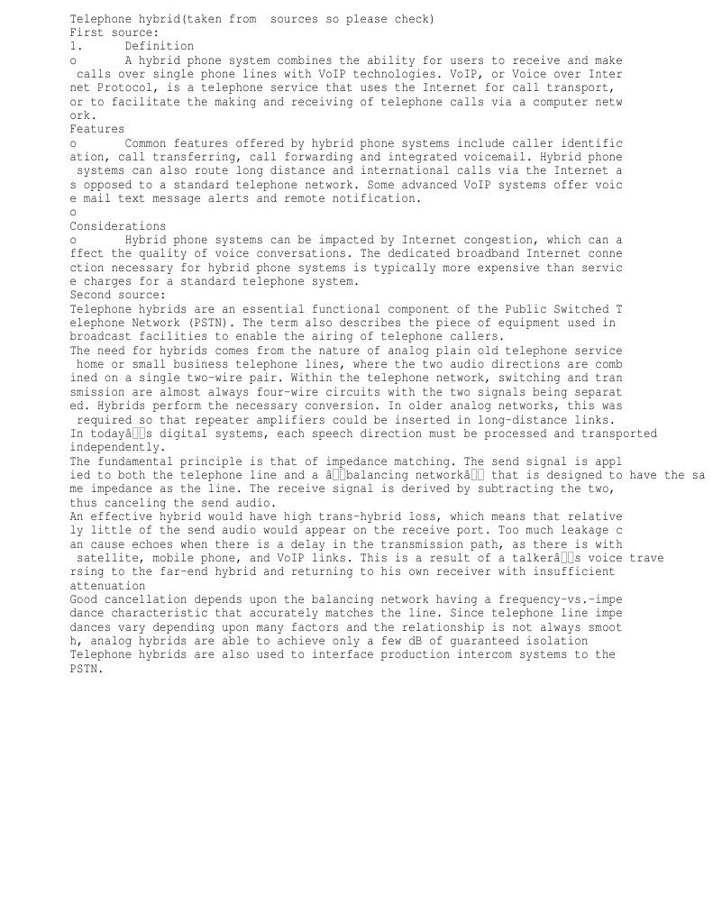Definition o A hybrid phone system combines the ability for users to receive and make calls over single phone lines with VoIP technologies. VoIP, or Voice over Inter net Protocol, is a telephone service that uses the Internet for call transport, or to facilitate the making and receiving of telephone calls via a computer netw ork. Features o Common features offered by hybrid phone systems include caller identific ation, call transferring, call forwarding and integrated voicemail. Hybrid phone systems can also route long distance and international calls via the Internet a s opposed to a standard telephone network. Some advanced VoIP systems offer voic e mail text message alerts and remote notification. o Considerations o Hybrid phone systems can be impacted by Internet congestion, which can a ffect the quality of voice conversations. The dedicated broadband Internet conne ction necessary for hybrid phone systems is typically more expensive than servic e charges for a standard telephone system. Second source: Telephone hybrids are an essential functional component of the Public Switched T elephone Network (PSTN). The term also describes the piece of equipment used in broadcast facilities to enable the airing of telephone callers. The need for hybrids comes from the nature of analog plain old telephone service home or small business telephone lines, where the two audio directions are comb ined on a single two-wire pair. Within the telephone network, switching and tran smission are almost always four-wire circuits with the two signals being separat ed. Hybrids perform the necessary conversion. In older analog networks, this was required so that repeater amplifiers could be inserted in long-distance links. In today s digital systems, each speech direction must be processed and transported independently. The fundamental principle is that of impedance matching. The send signal is appl ied to both the telephone line and a balancing network that is designed to have the sa me impedance as the line. The receive signal is derived by subtracting the two, thus canceling the send audio. An effective hybrid would have high trans-hybrid loss, which means that relative ly little of the send audio would appear on the receive port. Too much leakage c an cause echoes when there is a delay in the transmission path, as there is with satellite, mobile phone, and VoIP links. This is a result of a talker s voice trave rsing to the far-end hybrid and returning to his own receiver with insufficient attenuation Good cancellation depends upon the balancing network having a frequency-vs.-impe dance characteristic that accurately matches the line. Since telephone line impe dances vary depending upon many factors and the relationship is not always smoot h, analog hybrids are able to achieve only a few dB of guaranteed isolation Telephone hybrids are also used to interface production intercom systems to the PSTN.