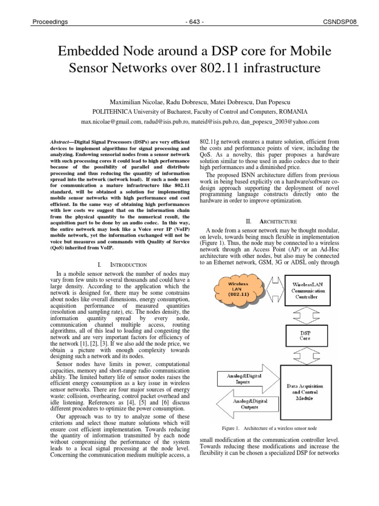 [1] G. Pottie. and W. Kaiser, Wireless integrated network sensors Communication of the ACM, 43, no. 5, 2000, pp. 51-58. [2] S. Olariu, L. Wilson, M. Eltoweissy, and K. Jones, Training a wireless sensor network, Mobile Networks and Appl., 10, 2005, pp. 151-167 [3] F. Akyildiz, W. Su, Y. Sankarasubramanian, and E. Cayirci, Wireless sensor networks: A survey, Comp. Networks, 38 (4), 2002, pp. 393422. [4] [Link] Dam and [Link], An Adaptive Energy-Efficient MAC Protocol for Wireless Sensor Networks, SenSys, 2003, pp.171-180 [5] J. Cortes, S. Martinez, T. Karatas, and Francesco Bullo, Coverage control for mobile sensing networks, IEEE Transactions on Robotics and Automation, vol. 20, 2004, pp. 243255 [6] C. Gui and P. Mohapatra, Power conservation and quality of surveillance in target tracking sensor networks, Information Processing in Sensor Networks, 2005, pp. 246 253 [7] A. Nisbet and S. Dobson, A systems architecture for sensor networks based on hardware/software co-design, In Mikhail Smirnov, editor, Proceedings of the 1st IFIP Workshop on Autonomic Communications, Springer Verlag, 2004, pp. 43-53. [8] R. Dobrescu, M. Nicolae, F. Stoica, and R. Varbanescu, Design of an Intelligent Sensor Network Node, Proceedings of the10th International Conference on Optimization of Electrical and Electronic Equipments OPTIM'06, 2006, pp. 71-78 [9] S. Baek; E. Choi, and J. Huh, Sensing information managing mechanism for context aware service in ubiquitous home network, Consumer Electronics, 2006, p. 51 52 [10] M. Kuorilehto, M. Hannikainen, and T. Hamalainen, A Survey of Application Distribution in Wireless Sensor Networks, EURASIP Journal on Wireless Communications and Networking, 2005, pp. 774-788 [11] J. J. E. Garzs, C. B. Calzn, and A. G. Armada, "An EnergyEfficient Adaptive Modulation suitable for Wireless Sensor Networks with SER and Throughput Constraints", EURASIP Journal on Wireless Communications and Networking, Issue 1, 2007, pp.23-33 [12] J. Shen, X. Yuan, L. Shen, D. Yao, and H. Liu, "An energyefficient node for wireless sensor networks using software radio," in Proceedings of the 6th IEEE International Conference on Electro/Information Technology (EIT '06), 2006, pp. 245-249