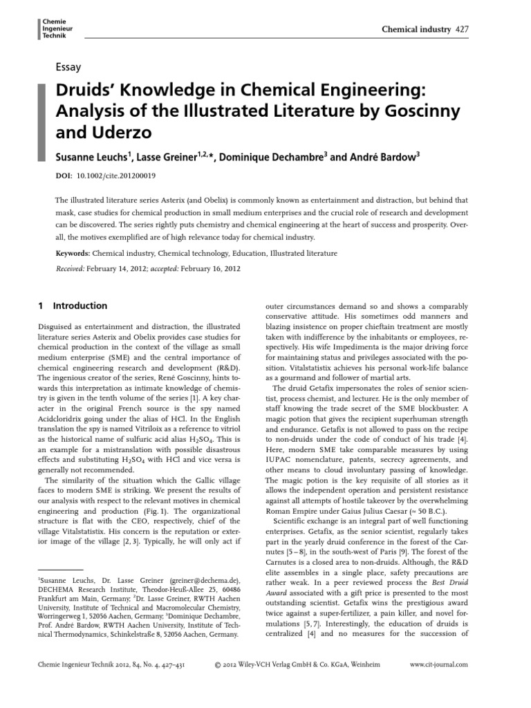 DOI: 10.1002/cite.201200019 The illustrated literature series Asterix (and Obelix) is commonly known as entertainment and distraction, but behind that mask, case studies for chemical production in small medium enterprises and the crucial role of research and development can be discovered. The series rightly puts chemistry and chemical engineering at the heart of success and prosperity. Overall, the motives exemplified are of high relevance today for chemical industry. Keywords: Chemical industry, Chemical technology, Education, Illustrated literature Received: February 14, 2012; accepted: February 16, 2012