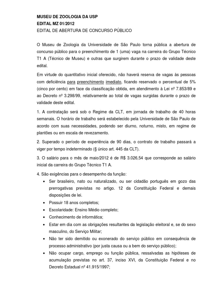 pública a abertura de concurso público para o preenchimento de 1 (uma) vaga na carreira do Grupo Técnico T1 A (Técnico de Museu) e outras que surgirem durante o prazo de validade deste edital. Em virtude do quantitativo inicial oferecido, não haverá reserva de vagas às pessoas com deficiência para preenchimento imediato, ficando reservado o percentual de 5% (cinco por cento) em face da classificação obtida, em atendimento à Lei nº 7.853/89 e ao Decreto nº 3.298/99, relativamente ao total de vagas surgidas durante o prazo de validade deste edital. 1. A contratação será sob o Regime da CLT, em jornada de trabalho de 40 horas semanais. O horário de trabalho será estabelecido pela Universidade de São Paulo de acordo com suas necessidades, podendo ser diurno, noturno, misto, em regime de plantões ou em escala de revezamento. 2. Superado o período de experiência de 90 dias, o contrato de trabalho passará a viger por tempo indeterminado (§ único art. 445 da CLT). 3. O salário para o mês de maio/2012 é de R$ 3.026,54 que corresponde ao salário inicial da carreira do Grupo Técnico T1 A. 4. São exigências para o desempenho da função: • Ser brasileiro, nato ou naturalizado, ou ser cidadão português em gozo das prerrogativas previstas no artigo. 12 da Constituição Federal e demais disposições de lei. • • • • Possuir 18 anos completos; Escolaridade: Ensino Médio completo; Conhecimento de informática; Estar em dia com as obrigações resultantes da legislação eleitoral e, se do sexo masculino, do Serviço Militar; • Não ter sido demitido ou exonerado do serviço público em consequência de processo administrativo (por justa causa ou a bem do serviço público); • Não ocupar cargo, emprego ou função pública, ressalvadas as hipóteses de acumulação previstas no art. 37, inciso XVI, da Constituição Federal e no Decreto Estadual nº 41.915/1997;