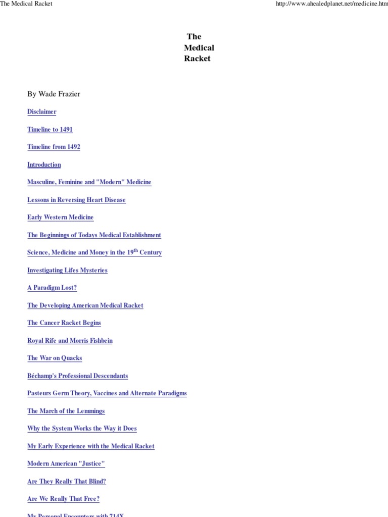 Disclaimer Timeline to 1491 Timeline from 1492 Introduction Masculine, Feminine and "Modern" Medicine Lessons in Reversing Heart Disease Early Western Medicine The Beginnings of Todays Medical Establishment Science, Medicine and Money in the 19th Century Investigating Lifes Mysteries A Paradigm Lost? The Developing American Medical Racket The Cancer Racket Begins Royal Rife and Morris Fishbein The War on Quacks Bchamp's Professional Descendants Pasteurs Germ Theory, Vaccines and Alternate Paradigms The March of the Lemmings Why the System Works the Way it Does My Early Experience with the Medical Racket Modern American "Justice" Are They Really That Blind? Are We Really That Free? My Personal Encounters with 714X