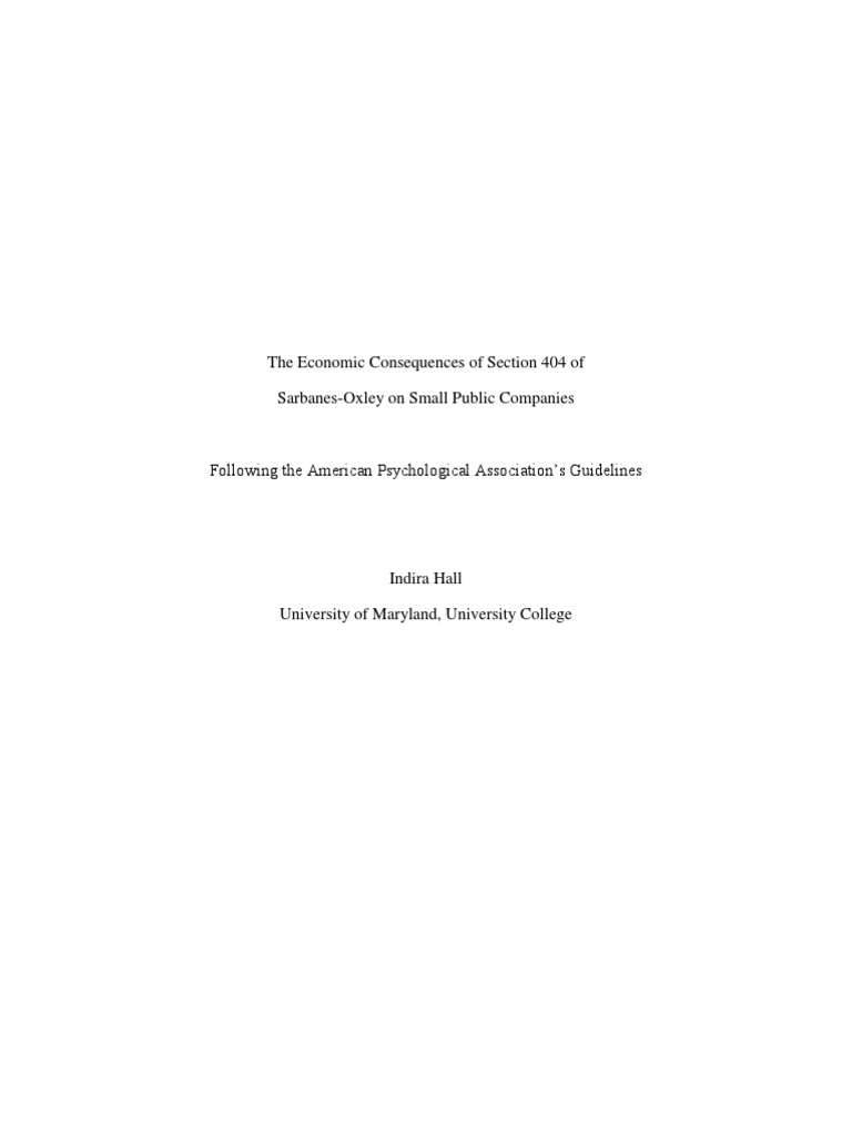 Resulting from the events that brutally shook U.S. capital markets in the early 2000s was new reform in the name of the Public Company Accounting Reform and Investor Protection Act of 2002, commonly known as the Sarbanes-Oxley Act (SOX) (Spiceland, Sepe, & Nelson, 2011, 16). The overall goal of this reform was to restore credibility and investor confidence in the financial reporting process (p.16). Accounting scandals were running rampant. With the collapse of Enron in 2011, the dismantling of Arthur Andersen in 2002, and accounting scandals at WorldCom, Xerox, Merck, and Adelphia Communications, something had to be done. Investors had lost billions of dollars and investor confidence was greatly affected (16). The Sarbanes-Oxley Act was controversial, seen as dramatic measures by some and necessary measures by others (pp. 16-17). It shifted business attitudes from what-you-dont-know-canthurt-you to honesty-is-the-best-policy (Bisoux, 2005, p.25). This paper will examine the economic consequences and benefits of increased financial reporting and disclosures required by SOX, specifically Section 404, on small public companies compared to large public companies. SOX consists of 11 titles that address auditor independence, corporate responsibility, enhanced financial disclosure, analyst conflicts of interest, corporate and criminal fraud accountability, white-collar crime penalty enhancements, and so on (Wang, 2008, p.3). SOX applies to all companies that are required to file reports with the SEC under the Securities Exchange Act of 1934 (p.3). Section 404 has been the most controversial part of SOX because its costs to implement have been substantial to all businesses, with a larger impact on small businesses (Bisoux, p.25). Small businesses are those classified as non-accelerated filers, which have public float of less than $75 million (Wang, p.3). Iliev (2010) references a study conducted by Duke University which found that increased regulations were one of the top concerns of U.S. corporations (p.1163). Section 404 focuses on internal controls, requiring that