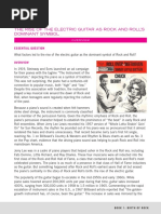 At that point the Gibson guitar factory was founded. Leo Fender started making the solid body guitar without the hollow section inside and became the standard shape from then onwards. Charlie Christian was brilliant in changing rhythm guitar playing into playing lead guitar T-Bone Walker was the person who drew from jazz style and country style to create his own style of guitar playing Djano Reinhardt was known for his ability to make the guitar sing Bo Didley (with the square guitar) was responsible to inventing the scratch effect when the guiar was strummed. This effect is percussive as Bo loved the drums. Chuck Berry helped supply the new guitar music to a white audience. Elvis Presley was also able to make rock n roll music available because he was white. Rock and roll was the first rock music style that took the American populations interst and this was symbolised and expressed by the guitar.