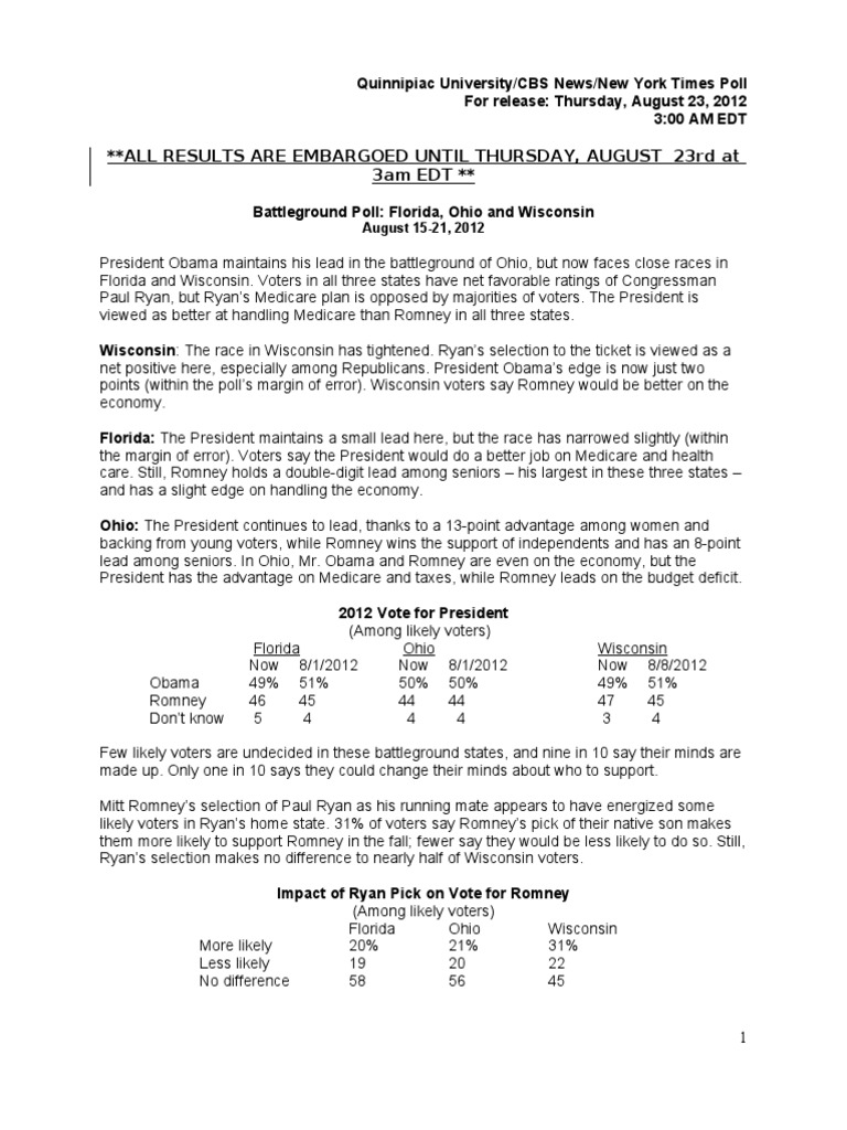 Quinnipiac University/CBS News/New York Times Poll For release: Thursday, August 23, 2012 3:00 AM EDT
