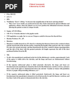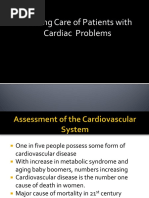 Cardiovascular Physical Assessment: - The complete assessment: o General appearance do they appear ill, hair appearance o Pain chest pain, duration, location, alleviation, when moving, 1-10 scale o Skin inspection changes in skin, mucous membrane, cyanosis (central -tongue, oral buccal mucosa; peripheral - nails, skin, nose, lips, earlobes) late sign of decrease cardiac output o Blood pressure pulse pressure (difference between systolic and diastolic), less than 30 pulse pressure represents a cardiac myopathy o Pulses during dysrhythmia must take apical pulse, assess quality, pulse deficit o Jugular venous distention indicative of right-sided heart failure (CVP central venous pressure) 45 degree angle position (semi-fowlers) Look for sternal notch The higher CVP the higher is the pulsation noted Put a ruler on sternal notch and measure the level of JVD from the neck with the ruler standing upright from the sternal notch o Heart inspection and palpation PMI (point of maximal impulse) movement of the apical of the heart when the ventricles contract o Chest excursion o Chest auscultation aortic, pulmonic, tricuspid, mitral, S1 and S2 (closure of the valves), S3 (splitting of the S1 Tennessee, splitting of the S2 Kentucky) and S4 (cardiac gallops), murmurs 1 to 6 / 6 (ex: 2/6 SEM (systolic ejection murmur) R SB (sternal border)) o Inspection of extremities o Other systems abdomen, skin, renal insufficiency, medication Age related changes: o Systolic blood pressure will increase with age o Widening pulse pressure o Isolated systolic hypertension (systolic is high) over 160 must be treated o Low diastolic pressure is not of concern o Effects of osteoporosis which affects more women related to the change of their skeletal system (kyphosis, lordosis)