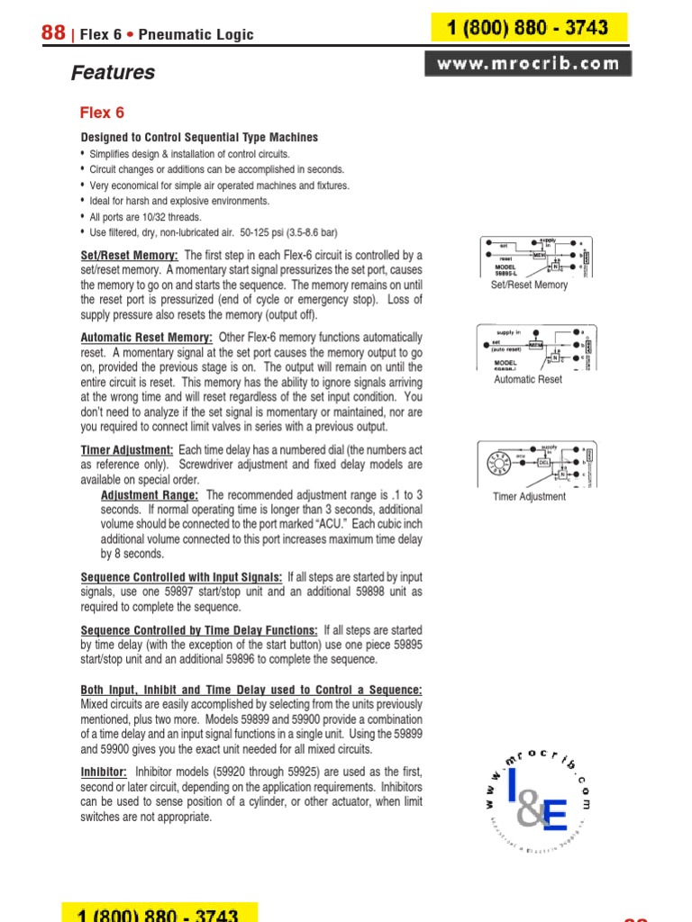 Designed to Control Sequential Type Machines Simplifies design & installation of control circuits. Circuit changes or additions can be accomplished in seconds. Very economical for simple air operated machines and fixtures. Ideal for harsh and explosive environments. All ports are 10/32 threads. Use filtered, dry, non-lubricated air. 50-125 psi (3.5-8.6 bar) Set/Reset Memory: The first step in each Flex-6 circuit is controlled by a set/reset memory. A momentary start signal pressurizes the set port, causes the memory to go on and starts the sequence. The memory remains on until the reset port is pressurized (end of cycle or emergency stop). Loss of supply pressure also resets the memory (output off). Automatic Reset Memory: Other Flex-6 memory functions automatically reset. A momentary signal at the set port causes the memory output to go on, provided the previous stage is on. The output will remain on until the entire circuit is reset. This memory has the ability to ignore signals arriving at the wrong time and will reset regardless of the set input condition. You dont need to analyze if the set signal is momentary or maintained, nor are you required to connect limit valves in series with a previous output. Timer Adjustment: Each time delay has a numbered dial (the numbers act as reference only). Screwdriver adjustment and fixed delay models are available on special order. Adjustment Range: The recommended adjustment range is .1 to 3 seconds. If normal operating time is longer than 3 seconds, additional volume should be connected to the port marked ACU. Each cubic inch additional volume connected to this port increases maximum time delay by 8 seconds. Sequence Controlled with Input Signals: If all steps are started by input signals, use one 59897 start/stop unit and an additional 59898 unit as required to complete the sequence. Sequence Controlled by Time Delay Functions: If all steps are started by time delay (with the exception of the start button) use one piece 59895 start/stop unit and an additional 59896 to complete the sequence. Both Input, Inhibit and Time Delay used to Control a Sequence: Mixed circuits are easily accomplished by selecting from the units previously mentioned, plus two more. Models 59899 and 59900 provide a combination of a time delay and an input signal functions in a single unit. Using the 59899 and 59900 gives you the exact unit needed for all mixed circuits. Inhibitor: Inhibitor models (59920 through 59925) are used as the first, second or later circuit, depending on the application requirements. Inhibitors can be used to sense position of a cylinder, or other actuator, when limit switches are not appropriate.