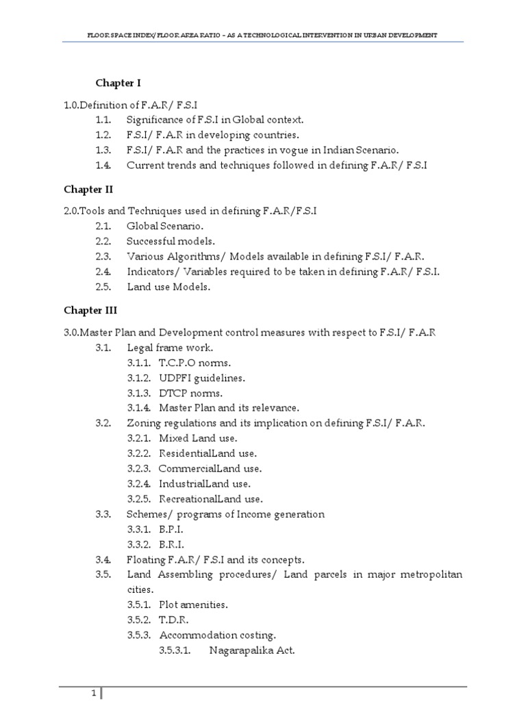 Chapter I 1.0.Definition of F.A.R/ F.S.I 1.1. Significance of F.S.I in Global context. 1.2. F.S.I/ F.A.R in developing countries. 1.3. F.S.I/ F.A.R and the practices in vogue in Indian Scenario. 1.4. Current trends and techniques followed in defining F.A.R/ F.S.I Chapter II 2.0.Tools and Techniques used in defining F.A.R/F.S.I 2.1. Global Scenario. 2.2. Successful models. 2.3. Various Algorithms/ Models available in defining F.S.I/ F.A.R. 2.4. Indicators/ Variables required to be taken in defining F.A.R/ F.S.I. 2.5. Land use Models. Chapter III 3.0.Master Plan and Development control measures with respect to F.S.I/ F.A.R 3.1. Legal frame work. 3.1.1. T.C.P.O norms. 3.1.2. UDPFI guidelines. 3.1.3. DTCP norms. 3.1.4. Master Plan and its relevance. 3.2. Zoning regulations and its implication on defining F.S.I/ F.A.R. 3.2.1. Mixed Land use. 3.2.2. ResidentialLand use. 3.2.3. CommercialLand use. 3.2.4. IndustrialLand use. 3.2.5. RecreationalLand use. 3.3. Schemes/ programs of Income generation 3.3.1. B.P.I. 3.3.2. B.R.I. 3.4. Floating F.A.R/ F.S.I and its concepts. 3.5. Land Assembling procedures/ Land parcels in major metropolitan cities. 3.5.1. Plot amenities. 3.5.2. T.D.R. 3.5.3. Accommodation costing. 3.5.3.1. Nagarapalika Act.