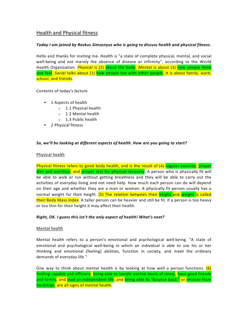 Today I am joined by Raskus Simsonyus who is going to discuss health and physical fitness. Hello and thanks for inviting me. Health is "a state of complete physical, mental, and social well-being and not merely the absence of disease or infirmity", according to the World Health Organization. Physical is (2) about the body. Mental is about (3) how people think and feel. Social talks about (1) how people live with other people. It is about family, work, school, and friends. Contents of todays lecture 1 Aspects of health o 1.1 Physical health o 1.2 Mental health o 1.3 Public health 2 Physical fitness