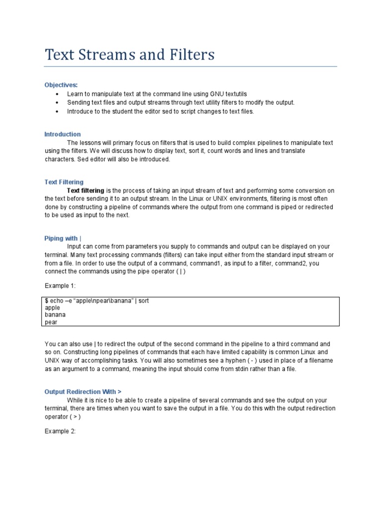 Introduction The lessons will primary focus on filters that is used to build complex pipelines to manipulate text using the filters. We will discuss how to display text, sort it, count words and lines and translate characters. Sed editor will also be introduced.