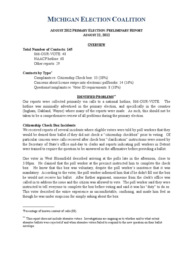 Report from the Michigan Election Coalition on incidents and irregularities in the August 2012 primary elections.