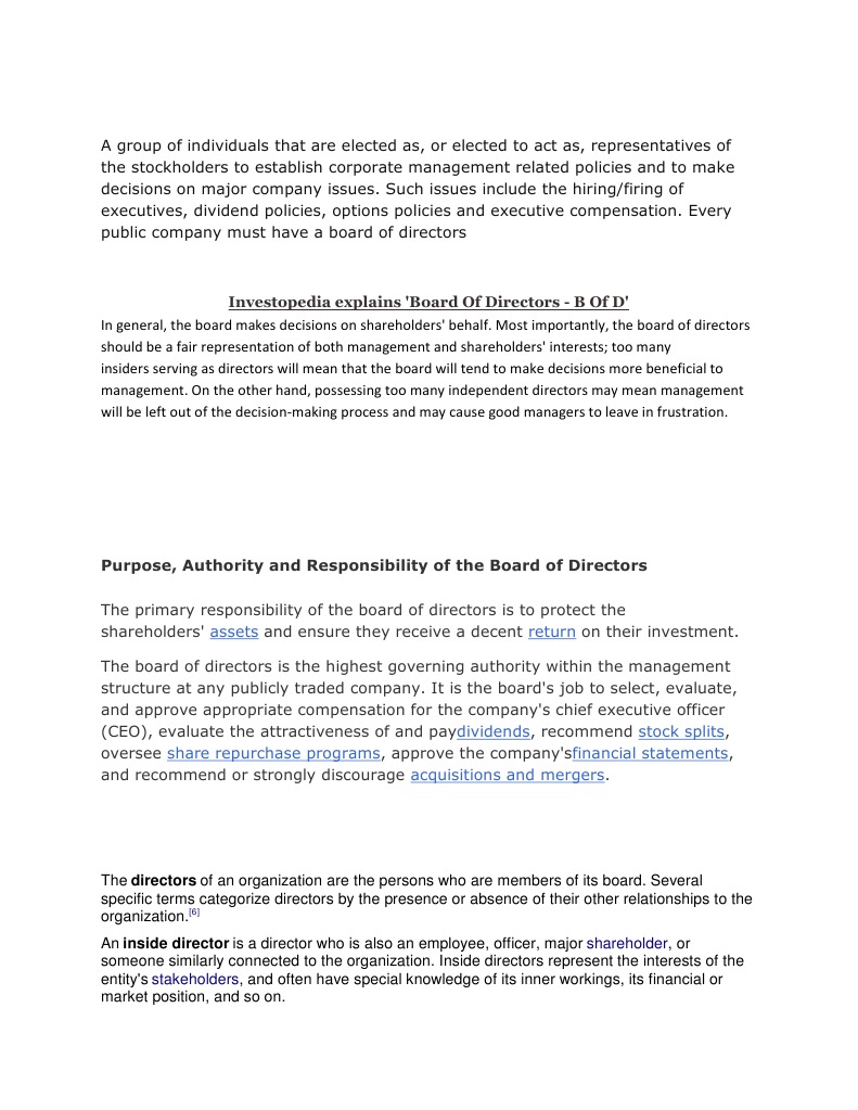 Investopedia explains 'Board Of Directors - B Of D' In general, the board makes decisions on shareholders' behalf. Most importantly, the board of directors should be a fair representation of both management and shareholders' interests; too many insiders serving as directors will mean that the board will tend to make decisions more beneficial to management. On the other hand, possessing too many independent directors may mean management will be left out of the decision-making process and may cause good managers to leave in frustration.