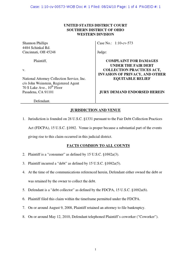 UNITED STATES DISTRICT COURT SOUTHERN DISTRICT OF OHIO WESTERN DIVISION Shannon Phillips 4484 Schinkal Rd. Cincinnati, OH 45248 Plaintiff, v. National Attorney Collection Service, Inc. c/o John Weinstein, Registered Agent 70 S Lake Ave., 10th Floor Pasadena, CA 91101 Defendant. JURISDICTION AND VENUE 1. Jurisdiction is founded on 28 U.S.C. 1331 pursuant to the Fair Debt Collection Practices Act (FDCPA), 15 U.S.C. 1692. Venue is proper because a substantial part of the events giving rise to this claim occurred in this judicial district. FACTS COMMON TO ALL COUNTS 2. Plaintiff is a consumer as defined by 15 U.S.C. 1692a(3). 3. Plaintiff incurred a debt as defined by 15 U.S.C. 1692a(5). 4. At the time of the communications referenced herein, Defendant either owned the debt or was retained by the owner to collect the debt. 5. Defendant is a debt collector as defined by the FDCPA, 15 U.S.C. 1692a(6). 6. Plaintiff filed this claim within the timeframe permitted under the FDCPA. 7. On or around August 9, 2008, Plaintiff retained an attorney to file bankruptcy. 8. On or around May 12, 2010, Defendant telephoned Plaintiffs coworker (Coworker). Case No.: 1:10-cv-573 Judge: COMPLAINT FOR DAMAGES UNDER THE FAIR DEBT COLLECTION PRACTICES ACT, INVASION OF PRIVACY, AND OTHER EQUITABLE RELIEF