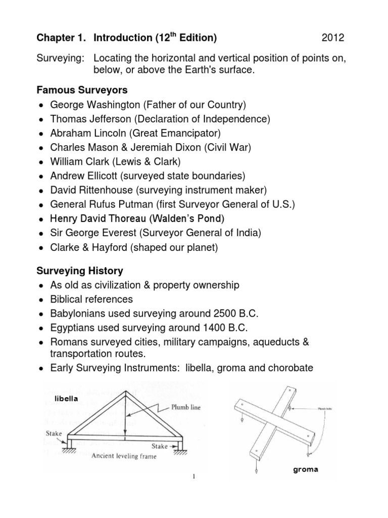 Surveying: Locating the horizontal and vertical position of points on, below, or above the Earth's surface. Famous Surveyors George Washington (Father of our Country) Thomas Jefferson (Declaration of Independence) Abraham Lincoln (Great Emancipator) Charles Mason & Jeremiah Dixon (Civil War) William Clark (Lewis & Clark) Andrew Ellicott (surveyed state boundaries) David Rittenhouse (surveying instrument maker) General Rufus Putman (first Surveyor General of U.S.) Henry David Thoreau (Waldens Pond) Sir George Everest (Surveyor General of India) Clarke & Hayford (shaped our planet) Surveying History As old as civilization & property ownership Biblical references Babylonians used surveying around 2500 B.C. Egyptians used surveying around 1400 B.C. Romans surveyed cities, military campaigns, aqueducts & transportation routes. Early Surveying Instruments: libella, groma and chorobate