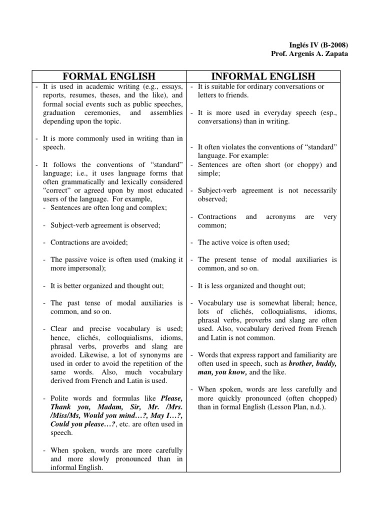 - It is used in academic writing (e.g., essays, reports, resumes, theses, and the like), and formal social events such as public speeches, graduation ceremonies, and assemblies depending upon the topic. - It is more commonly used in writing than in speech. - It follows the conventions of standard language; i.e., it uses language forms that often grammatically and lexically considered correct or agreed upon by most educated users of the language. For example, - Sentences are often long and complex; - Subject-verb agreement is observed; - Contractions are avoided; - The passive voice is often used (making it more impersonal); - It is better organized and thought out; - The past tense of modal auxiliaries is common, and so on. - Clear and precise vocabulary is used; hence, clichs, colloquialisms, idioms, phrasal verbs, proverbs and slang are avoided. Likewise, a lot of synonyms are used in order to avoid the repetition of the same words. Also, much vocabulary derived from French and Latin is used. - Polite words and formulas like Please, Thank you, Madam, Sir, Mr. /Mrs. /Miss/Ms, Would you mind?, May I?, Could you please?, etc. are often used in speech. - When spoken, words are more carefully and more slowly pronounced than in informal English.