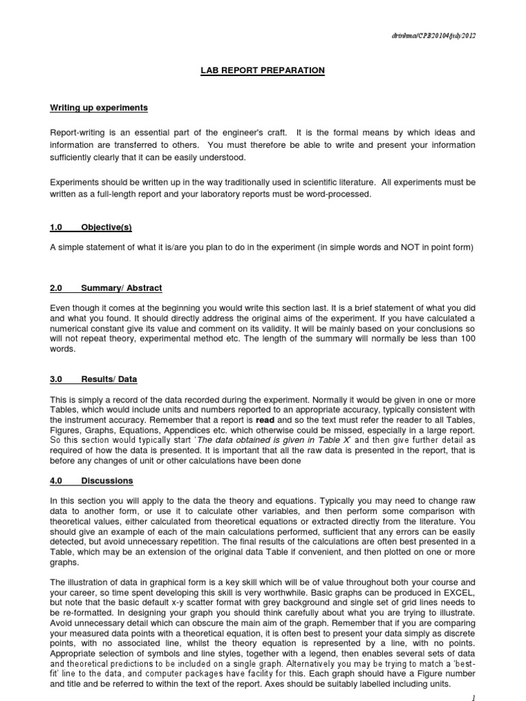 Writing up experiments Report-writing is an essential part of the engineer's craft. It is the formal means by which ideas and information are transferred to others. You must therefore be able to write and present your information sufficiently clearly that it can be easily understood. Experiments should be written up in the way traditionally used in scientific literature. All experiments must be written as a full-length report and your laboratory reports must be word-processed.