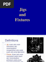 This document discusses various components used in jigs and fixtures for manufacturing including a drill bush, engsel, rahang cekam, poros penggerak rahang, workpiece, and locator to precisely hold and guide tools and parts during manufacturing processes. The components work together to securely hold a workpiece in place while a manufacturing process is performed.