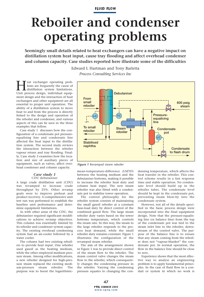 eat exchanger operating problems are frequently the cause of distillation system limitations. Unit process design, individual equipment design and the interaction of heat exchangers and other equipment are all essential to proper unit operation. The ability of a distillation system to move heat to and from the process is directly linked to the design and operation of the reboiler and condenser, and various aspects of this can be seen in the three examples that follow. Case study 1 discusses how the configuration of a condensate pot pressureequalising line and condensate line affected the heat input to the distillation system. The second study reviews the interaction between the reboiler vapour return and tray flooding. Finally, Case study 3 examines how the location and size of auxiliary pieces of equipment, such as valves, affect overhead condenser and column capacity.