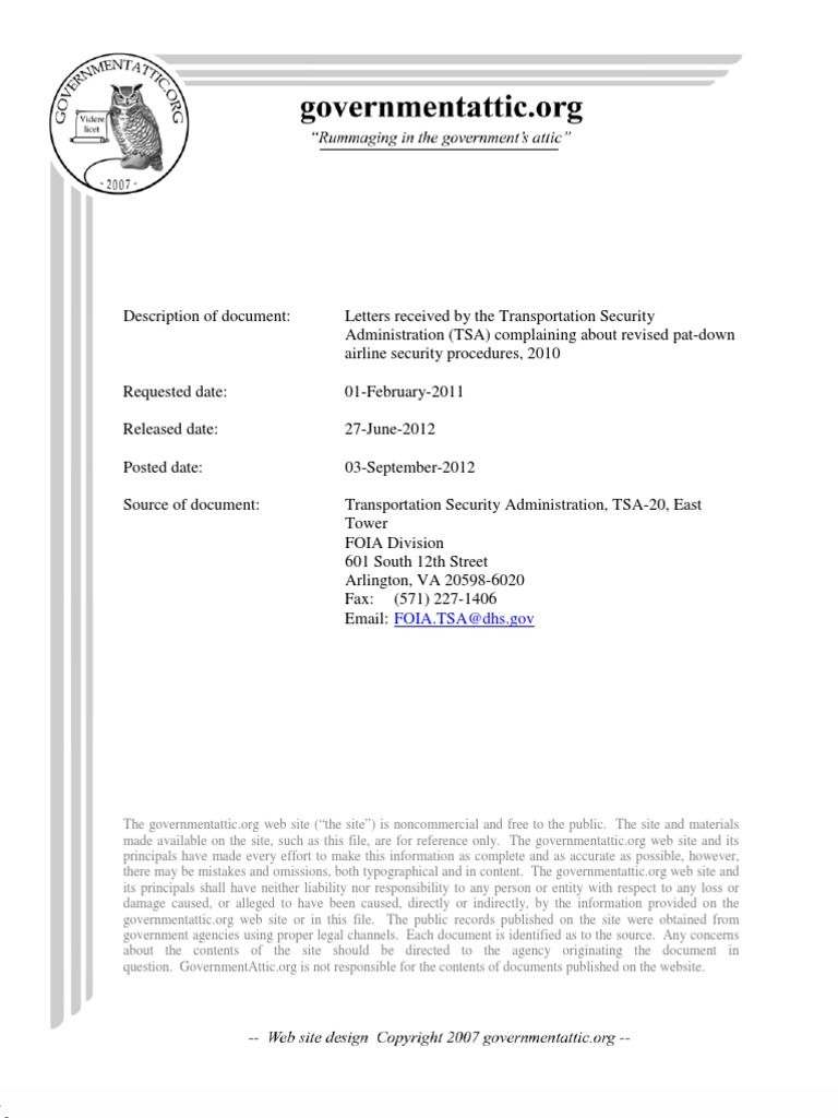Description of document: Letters received by the Transportation SecurityAdministration (TSA) complaining about revised pat-downairline security procedures, 2010Requested date: 01-February-2011Released date: 27-June-2012Posted date: 03-September-2012Source of document: Transportation Security Administration, TSA-20, EastTowerFOIA Division601 South 12th StreetArlington, VA 20598-6020Fax: