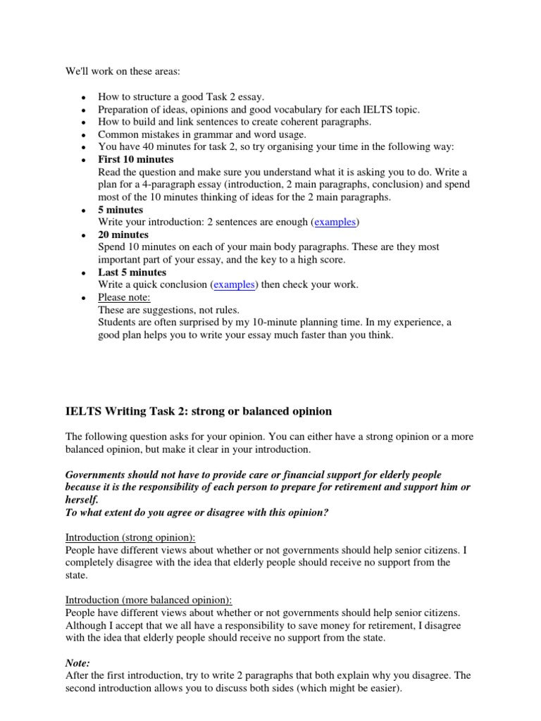 How to structure a good Task 2 essay. Preparation of ideas, opinions and good vocabulary for each IELTS topic. How to build and link sentences to create coherent paragraphs. Common mistakes in grammar and word usage. You have 40 minutes for task 2, so try organising your time in the following way: First 10 minutes Read the question and make sure you understand what it is asking you to do. Write a plan for a 4-paragraph essay (introduction, 2 main paragraphs, conclusion) and spend most of the 10 minutes thinking of ideas for the 2 main paragraphs. 5 minutes Write your introduction: 2 sentences are enough (examples) 20 minutes Spend 10 minutes on each of your main body paragraphs. These are they most important part of your essay, and the key to a high score. Last 5 minutes Write a quick conclusion (examples) then check your work. Please note: These are suggestions, not rules. Students are often surprised by my 10-minute planning time. In my experience, a good plan helps you to write your essay much faster than you think.