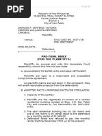 DEFENDANT, by counsel and to this Honorable Court, respectfully submits this Pre-Trial Brief in compliance with the trial courts order. I Defendant is willing to enter into an amicable settlement of the case, under term and condition agreeable to both parties and submit to alternative modes of dispute resolution; II Defendant admits the following: A. Paragraph 1 of the complaint.