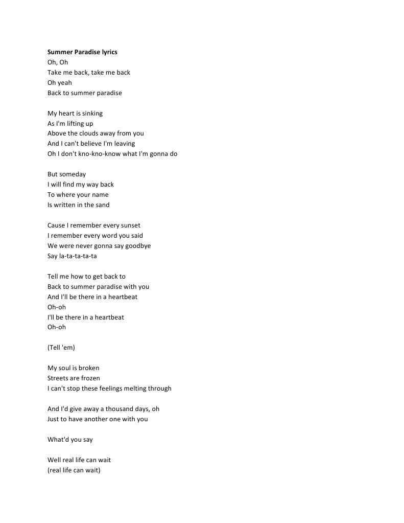 lifting up Above the clouds away from you And I can't believe I'm leaving Oh I don't kno-kno-know what I'm gonna do But someday I will find my way back To where your name Is written in the sand Cause I remember every sunset I remember every word you said We were never gonna say goodbye Say la-ta-ta-ta-ta Tell me how to get back to Back to summer paradise with you And I'll be there in a heartbeat Oh-oh I'll be there in a heartbeat Oh-oh (Tell 'em) My soul is broken Streets are frozen I can't stop these feelings melting through And I'd give away a thousand days, oh Just to have another one with you What'd you say Well real life can wait (real life can wait)