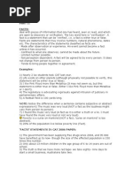 FACTS: Deal with pieces of information that one has heard, seen or read, and which are open to discovery or verification. The key word here is "verification". A fact is a statement that can be 'verified', i.e. a fact is either true or false. Facts are statements that may involve numbers, natural phenomena, dates etc. The characteristics of the statements classified as facts are: Made after observation or experience. An event cannot become a fact unless it has occurred. Confined to what one observes; cannot be made about the future. Limited number possible. Not perception dependent. A fact will be agreed to by every person. It does not change from person to person. Tends to bring people together in agreement.
