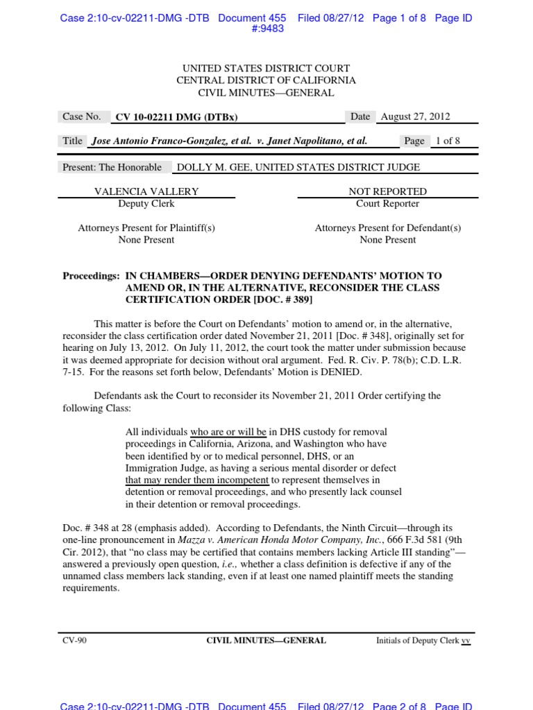 This matter is before the Court on Defendants’ motion to amend or, in the alternative,reconsider the class certification order dated November 21, 2011 [Doc. # 348], originally set for hearing on July 13, 2012. On July 11, 2012, the court took the matter under submission becauseit was deemed appropriate for decision without oral argument. Fed. R. Civ. P. 78(b); C.D. L.R.7-15. For the reasons set forth below, Defendants’ Motion is DENIED.Defendants ask the Court to reconsider its November 21, 2011 Order certifying thefollowing Class:All individuals who are or will be in DHS custody for removal proceedings in California, Arizona, and Washington who have been identified by or to medical personnel, DHS, or anImmigration Judge, as having a serious mental disorder or defectthat may render them incompetent to represent themselves indetention or removal proceedings, and who presently lack counselin their detention or removal proceedings.Doc. # 348 at 28 (emphasis added). According to Defendants, the Ninth Circuit—through itsone-line pronouncement in