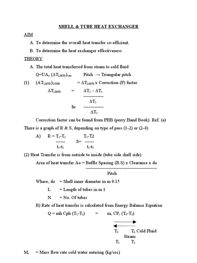 To determine the heat exchanger effectiveness THEORY A. The total heat transferred from steam to cold fluid Q=UAo (TLMTD)corr (1) (ATLMTD)CORR TLMTD = In Pitch Triangular pitch = TLMTD x Correction (F) factor T2 T1 ------------T2 ------------T2