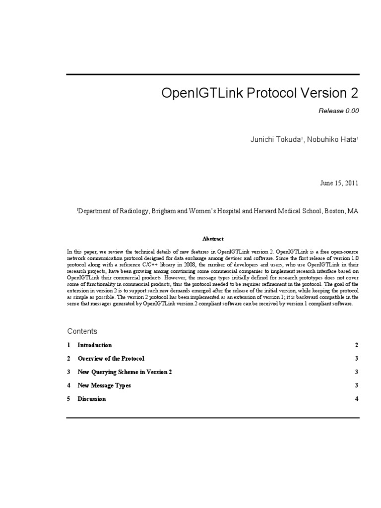 Device/software communication is essential in todays IGT. It is quite common to locate surgical tools relative to the patient's body by using position tracking systems with optical (1), electromagnetic (2), or ultrasonic (3,4) sensors, or to acquire images using real-time ultrasound, computed tomography, or magnetic resonance imaging (MRI). Those sensor and image data are often transferred to surgical navigation software for visualization enabling the physicians to know the accurate target lesion, or monitor the progress of treatment noninvasively. In addition, the use of robotic assistance is becoming reality, requiring additional communication between the navigation software and robotic hardware. Therefore, major task for researchers and developers in the field of IGT is to design a system consisting of multiple devices and software, and integrate them by establishing communication among those components. Currently, many vendors provide proprietary application programming interface (API) that allows external software/hardware communicating with their products. However, lack of standardized interface raises serious constraints in the system integration; the developers are forced to spend considerable time to understanding and implementing device-specific interfaces; the interfaces from different vendors are not compatible; proprietary interface often requires special contract that comes with non-disclosure agreement and/or expensive license fee. To address the abovementioned issue, we launched a project to provide a standardized mechanism to connect software/hardware through the network for IGT applications. The core engineering effort is development of an open network communication protocol, OpenIGTLink (5). The protocol is defined as a set of simple binary message formats, which are necessary to transfer various types of data exchanged among the software/hardware used in IGT. The protocol is provided as a document as well as a free opensource reference C/C++ library with example programs. The idea behind our open-source strategy is to maximize the number of products that have OpenIGTLink compliant interfaces by providing a freelyavailable, simple, extensible and reliable protocol that attracts a wide range of developers including academic researchers and industrial developers to the community. Since the first release of version 1.0 protocol along with a reference C/C++ library and interface in medical image processing and visualization software, 3D Slicer, in 2008, the number of developers and users, who use OpenIGTLink in their research projects, have been growing especially among academic researchers convincing some commercial companies to implement research interface based on OpenIGTLink their commercial products. However, the message types initially defined for research prototypes does not cover some of functionality in commercial products, thus the protocol needed to be requires refinement in the protocol. Since Sumer Project Week 2010 of NIH-funded National Alliance for Medical Image Computing, we have been working on extension of the protocol, which will be released as OpenIGTLlink protocol version 2. The goal of the extension is to support the new demands emerged after the release of the initial version, while we keep the protocol as simple as possible. The version 2 protocol has been implemented as an extension of version 1; it is backward compatible in the sense that messages generated by OpenIGTLink version 2 compliant software can be received by version 1 compliant software. The new protocol defines a set of new message types with new querying scheme. In this paper, we review the technical details of new features.