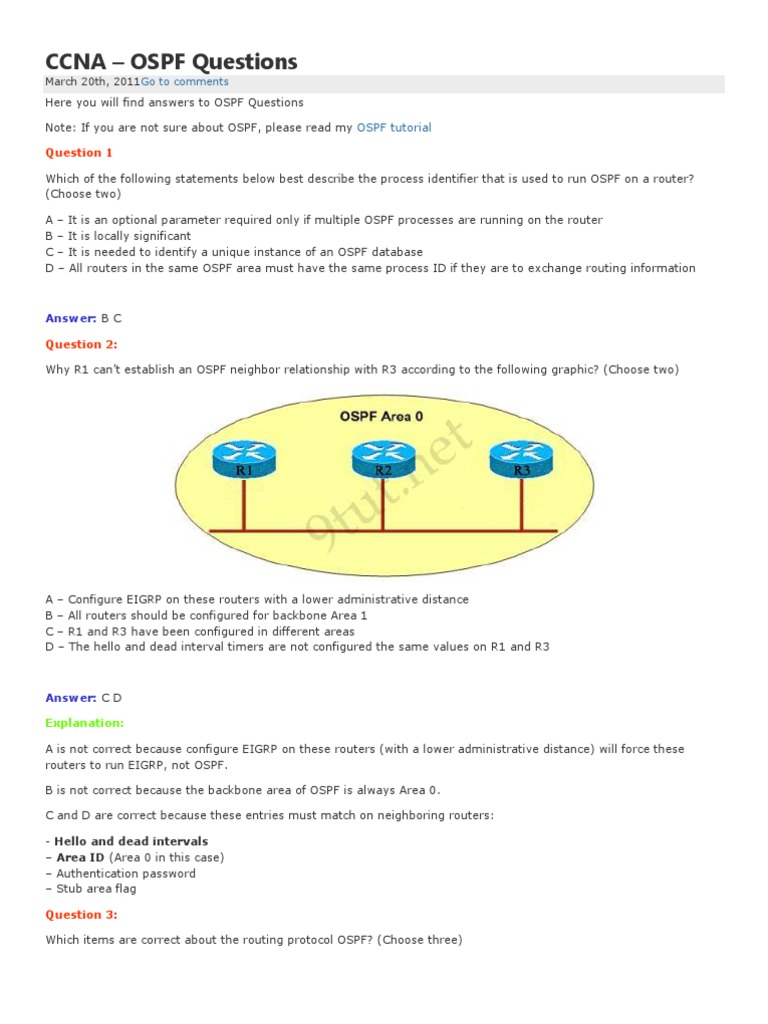 Answer: C D Explanation: A is not correct because configure EIGRP on these routers (with a lower administrative distance) will force these routers to run EIGRP, not OSPF. B is not correct because the backbone area of OSPF is always Area 0. C and D are correct because these entries must match on neighboring routers: - Hello and dead intervals Area ID (Area 0 in this case) Authentication password Stub area flag Question 3: Which items are correct about the routing protocol OSPF? (Choose three)