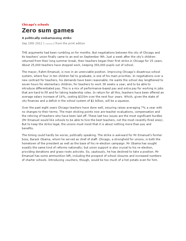THE arguments had been rumbling on for months. But negotiations between the city of Chicago and its teachers union finally came to an end on September 9th. Just a week after the citys children returned from their long summer break, their teachers began their first strike in Chicago for 25 years. About 25,000 teachers have stopped work, keeping 350,000 pupils out of school. The mayor, Rahm Emanuel, is now in an unenviable position. Improving Chicagos disastrous school system, where four in ten children fail to graduate, is one of his main priorities. In negotiations over a new contract for teachers, his demands have been reasonable. He wants the school day lengthened to seven hours for elementary children, for teachers to work 38 weeks a year, and to be able to introduce differentiated pay. This is a mix of performance-based pay and extra pay for working in jobs that are hard to fill and for taking leadership roles. In return for all this, teachers have been offered an average salary increase of 16%, costing $320m over the next four years. Which, given the state of city finances and a deficit in the school system of $1 billion, will be a squeeze. Over the past eight years Chicago teachers have done well, securing raises averaging 7% a year with no changes to their terms. The main sticking points now are teacher evaluations, compensation and the rehiring of teachers who have been laid off. These last two issues are the most significant hurdles (Mr Emanuel would like schools to be able to hire the best teachers, not the most recently-fired ones). But to keep the strike legal, the unions must insist that it is about nothing more than pay and benefits. The timing could hardly be worse, politically speaking. The strike is awkward for Mr Emanuels former boss, Barack Obama, whom he served as chief of staff. Chicago, a stronghold for unions, is both the hometown of the president as well as the base of his re-election campaign. Mr Obama has sought exactly the same kind of reforms nationally; but union support is also crucial to his re-election, providing donations and grass-roots activists. So, cautiously, he has declined to take a position. Mr Emanuel has some ammunition left, including the prospect of school closures and increased numbers of charter schools. Introducing vouchers, though, would be too much of a hot potato even for him.