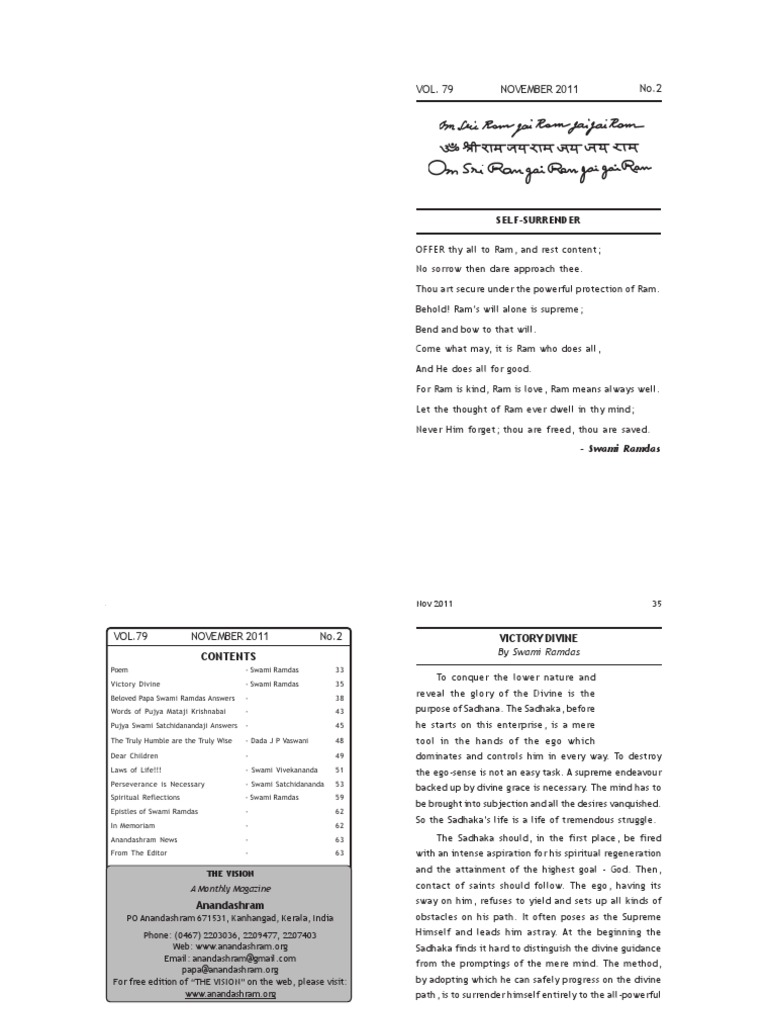 PO Anandashram 671531, Kanhangad, Kerala, India Phone: (0467) 2203036, 2209477, 2207403 Web: [Link] Email: anandashram@[Link] papa@[Link] For free edition of THE VISION on the web, please visit: [Link]