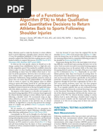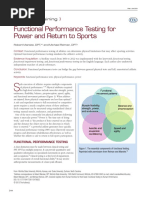 directly with actual physical function. This is the reason for functional performance testing. The lack of clinical correlation also makes it imperative that functional testing as described in this book be performed to ensure that the individual can safely return to the given activity. Compared to the classical objective measures of physical function, functional performance testing more closely mimics physical activities that people wish to return to. For example, the fact that a person has full shoulder range of motion does not mean that he or she can throw a softball far enough to return to full unrestricted play. If this same person has full range of motion, full strength, and full neuromuscular control and additionally is able to achieve an excellent score on the Underkoffler softball throw without adverse symptoms, we are much more confident about the prospect of a safe return to unrestricted overhead throwing activities. Even though some feel that observing the performance of an individuals usual activities is time-consuming (Verbrugge & Jette 1994), many functional tests closely approximate the activities that people need or wish to do. Physical performance tests have varying amounts of complexity and impose different levels of physical demand. The clinician should ensure that testing is at the appropriate level and occurs at the appropriate time for the individual client. Functional performance testing should not be done in a random, haphazard manner. As with any objective measurement used to assess an injured client, one should carefully evaluate the appropriateness of each test before introducing it. For example, a client who is only six weeks post anterior cruciate ligament reconstruction is not an appropriate candidate for performance of the single-leg hop test. This test would be far too aggressive. It would be more appropriate and much safer to use the single-leg timed stance. Davies and Zillmers (2000) functional testing algorithm (FTA) is an objective, systematic, functional-based testing progression according to which the client must pass one level of functional performance testing before proceeding to a higher-level test. The FTA appears to provide a safe and effective way to perform a variety of testing maneuvers. Chapter 3 describes the use of the FTA in detail.